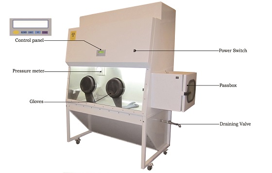 The cabinet is completely sealed, and all operations are conducted through gloves attached to the front panel. Air entering and exiting the cabinet is filtered through HEPA/ULPA filters, ensuring complete containment of potentially hazardous agents and preventing any contamination of the external environment.